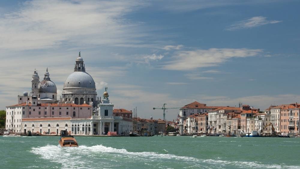 The party takes place aboard a 10-seater motorboat cruising through the Venetian lagoon.